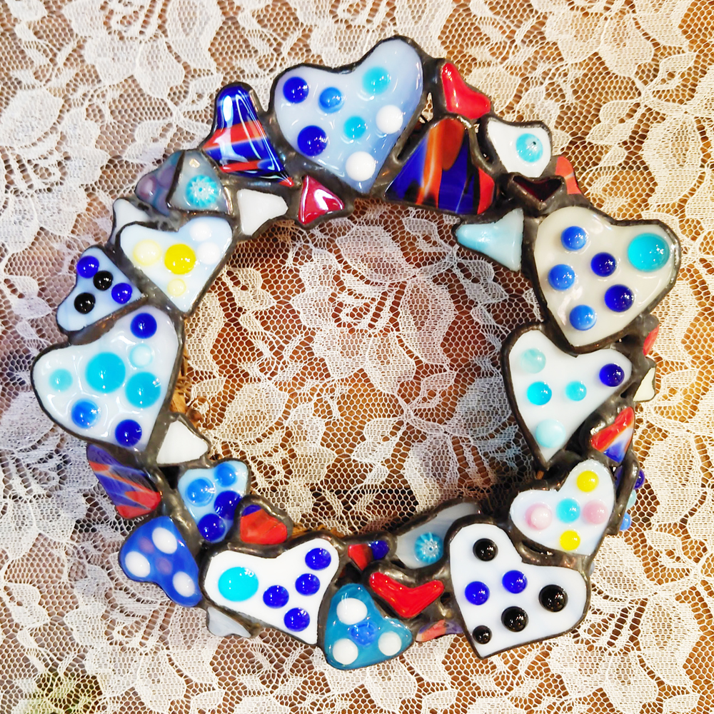 ころころの水玉がかわいいハートを散りばめたリースはいかがでしょう?